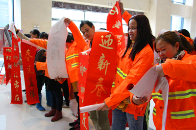 “春滿人間百花吐艷 福臨小院四季常安” “一帆風(fēng)順年年好 萬(wàn)事如意步步高” ……1月26日至28日,麗匯大廈一樓熱鬧非凡,為了感激社會(huì)各界對(duì)綠港集團(tuán)的關(guān)心與支持,由綠港集團(tuán)工會(huì)組織的書法家“迎新春 送祝?!绷x務(wù)送春聯(lián)活動(dòng)吸引了大量前來求墨寶的社會(huì)各界人士。三位南寧市書法協(xié)會(huì)的書法家以及南寧科巨公司副總經(jīng)理陸章發(fā)為觀眾們現(xiàn)場(chǎng)揮毫,一幅幅金燙燙、散發(fā)著墨香的春聯(lián)映襯著人們的笑臉,整個(gè)現(xiàn)場(chǎng)彌漫著濃濃的年味,短短三天時(shí)間便送出了2000多副春聯(lián)。1月26日上午,綠港集團(tuán)工會(huì)還啟動(dòng)了派送春聯(lián)儀式,綠港集團(tuán)工會(huì)主席黃麗琴帶領(lǐng)工會(huì)人員將春聯(lián)送到經(jīng)開區(qū)40余位保潔人員、園林綠化工人、公司職工的手上。(張彩秀/文、圖)