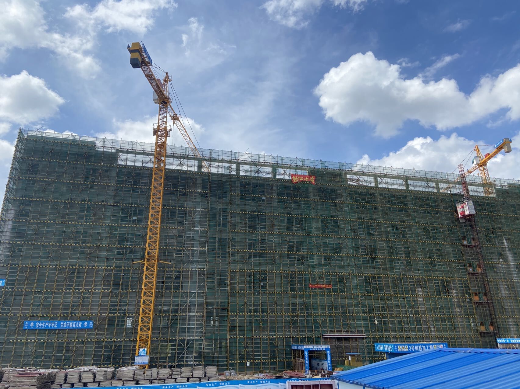 在項目施工過程中,綠港集團堅持做好項目各樓棟臨邊防護標(biāo)準(zhǔn)化、用料場地封閉標(biāo)準(zhǔn)化、設(shè)置安全宣傳長廊、裸土覆蓋措施、塔吊與道路噴淋系統(tǒng)、車輛沖洗系統(tǒng)、門禁與實名制管理系統(tǒng)、安全交底和特殊工種教育等工作,每周召開安全文明施工專項會議,對于安全文明月度檢查發(fā)現(xiàn)的安全隱患問題項目部做到高度重視,積極安排安全員專人跟蹤整改,在規(guī)定時間內(nèi)按標(biāo)準(zhǔn)化要求整改完成。項目部積極開展安全演練、知識競賽、安全會議、班組活動、三級教育等活動宣傳安全生產(chǎn)知識,進行安全生產(chǎn)教育,增強建設(shè)人員安全生產(chǎn)意識。